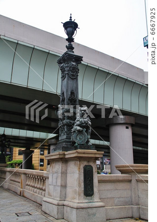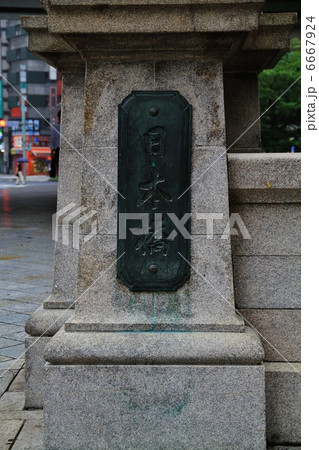 日本橋に隣接して歩道側に設置されている「日本国道路元標」の複製と「東京市道路元標」