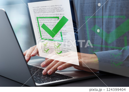 書類の作成や準備。書類とチェックマーク。コンプライアンスと文書化のイメージ。ノートパソコンのキーボー