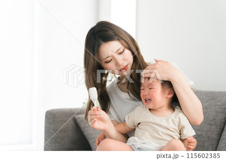 子どもの体温を測る若いアジア人の母親・ママ(発熱・熱・風邪・泣く)