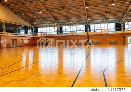 学校の体育館、日差しが入る明るい体育館、中学校の体育館、公共施設のバスケットコート