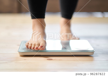 体重計に乗るアジア人女性の足元