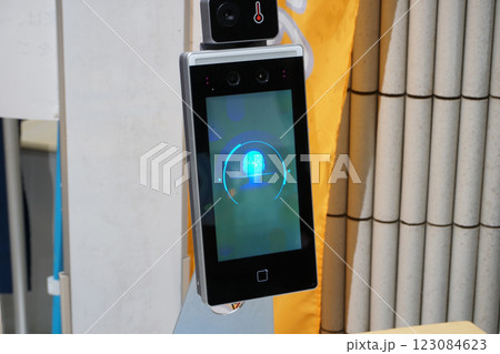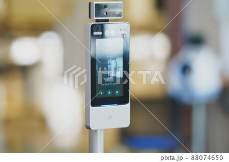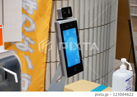 施設入り口での顔認証・体表面温度測定器で検査