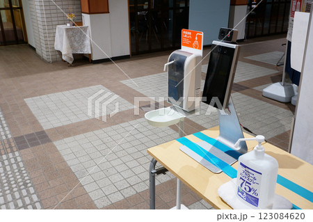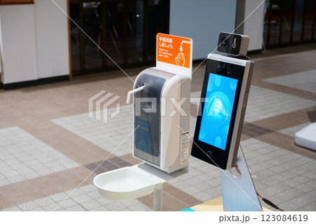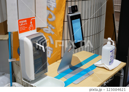 施設入り口の顔認証・体表面温度測定器と手指消毒剤