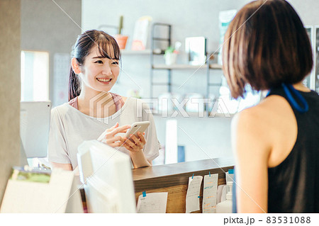 受付でスマホを出す女性