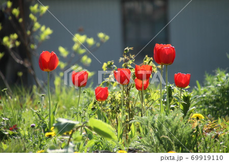 裏庭に自然に咲く数本のチューリップ,レトロ風