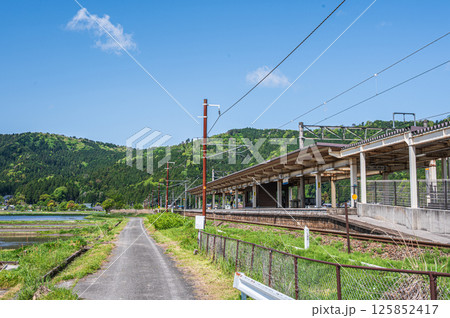 北陸本線余呉駅と新緑の山 滋賀県長浜市余呉町