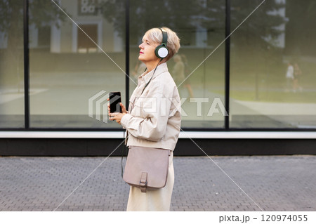 Beautiful Mature Woman with Short Hair Wearing Headphones and Beige Clothing, Walking Outdoors in City While Listening to Music, Podcasts or Audiobook