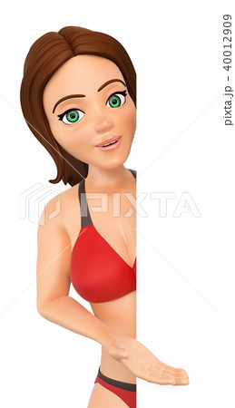 3D Woman in bikini pointing aside. Blank poster