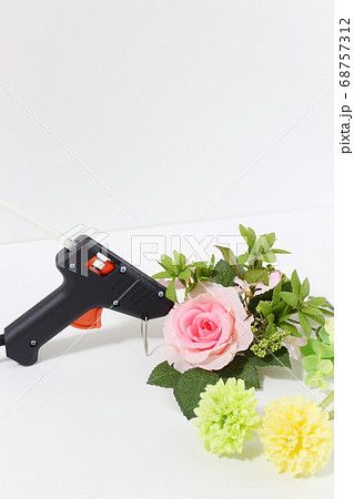グルーガンで造花をくっつける【ハンドメイド・手芸イメージ】【白背景・アップ】