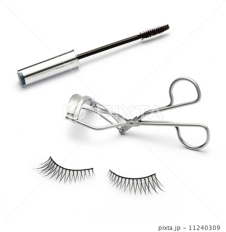 fake false eyelash with eyelash curler and mascara on white