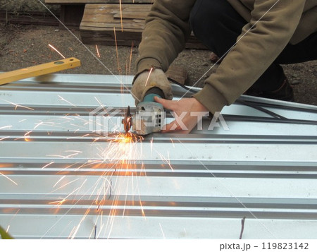 A man in work clothes and gloves uses a grinder to cut or saw a metal sheet or canvas on asphalt, causing sparks to fly