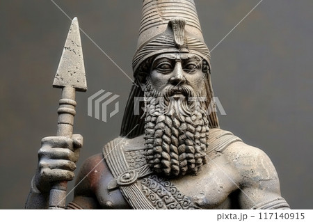 An imposing Assyrian warrior stands confidently, gripping a spear, adorned in intricate armor, embodying the spirit of ancient warfare and power.