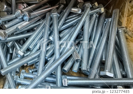 Industrial landscape of threaded bolts stacked in a wooden crate