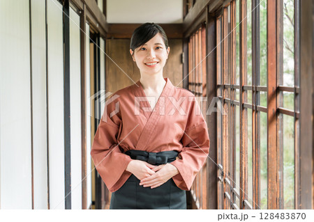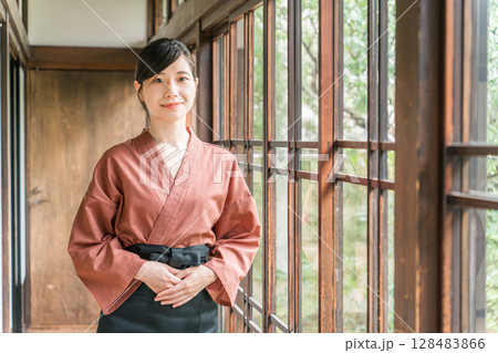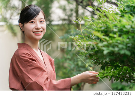 旅館の庭を眺める作務衣姿の仲居さん旅館スタッフの女性