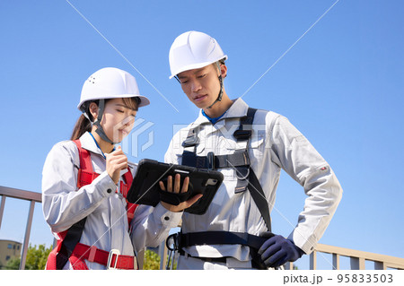 高所作業の安全管理責任者 フルハーネスを着用した男女の作業員