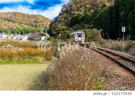 晩秋の姫新線 ススキと紅葉の中を行く作用駅行き普通列車1 兵庫県佐用郡佐用町
