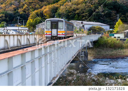 晩秋の姫新線 佐用川の鉄橋を渡る作用駅行き普通列車1 兵庫県佐用郡佐用町