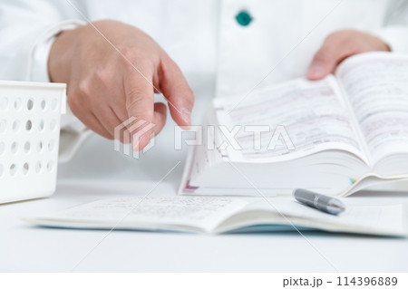 お薬手帳で薬の確認をしている調剤薬局の薬剤師の手元