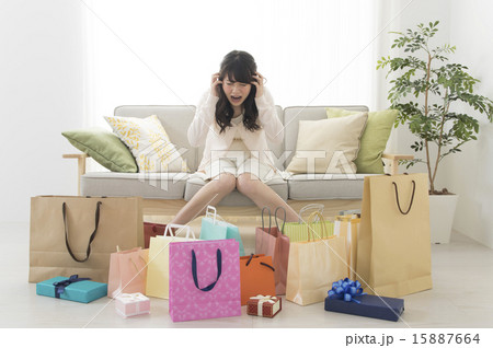 ショッピングイメージ 買い物をしすぎてショックをうける若い女性
