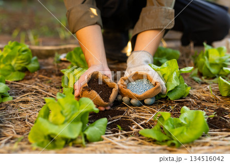 化学肥料と有機堆肥を両手に持つ比較イメージ 農法の選択と使い分け