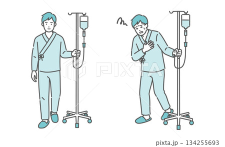 点滴スタンドを押して歩く男性と、胸を押さえて苦しむ男性(比較セット)