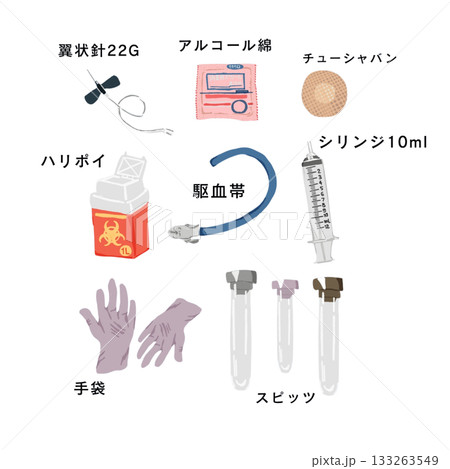 採血に必要な物品セット|看護・医療イラスト|翼状針・ハリポイ・スピッツ・駆血帯・シリンジ・アルコール
