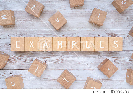 「e.g.」と書かれた積み木、ノート、ペン、人の手