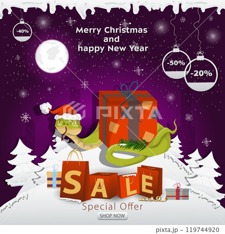 A Christmas sale banner with an inscription in the form of packages in a snowy clearing a snake in a Santa hat wraps around a gift box