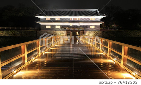 雨で濡れてライトアップが映える夜の鼠多門橋2