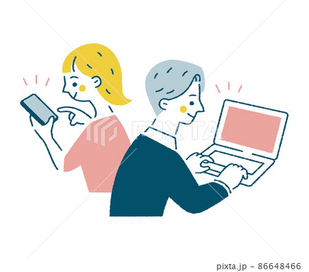 スマートフォンとパソコンを操作する女性と男性の淡色ベクターイラスト