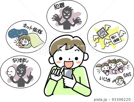 笑顔でスマホを操作する男の子とスマホに関するトラブル