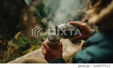 Pouring Coffee from Thermos Outdoors