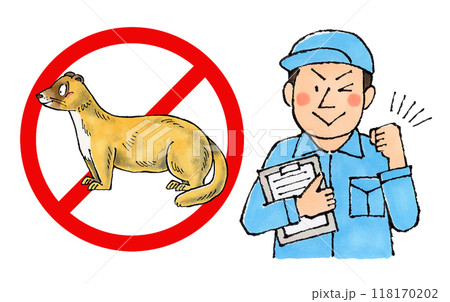 イタチ駆除業者の男性作業員(イタチ禁止マーク)