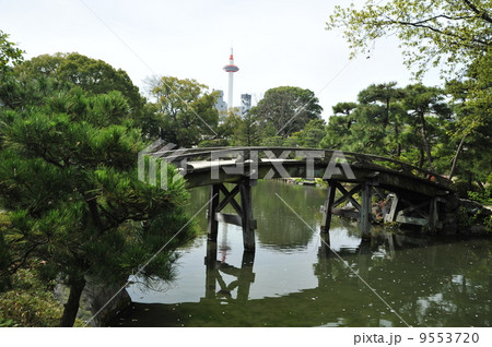 京都 渉成園 印月池の侵雪橋と水に映る京都タワー