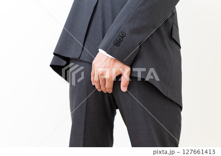 お尻を押さえて苦しむスーツ姿のミドル男性ビジネスマン