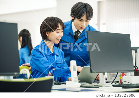 オフィスでデスクワークをする作業服を着た若い女性
