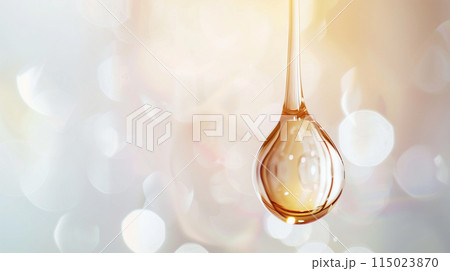 リッチ感と潤い感のある黄金色の美容ジェルのしずくのマクロクローズアップ(AI生成画像)