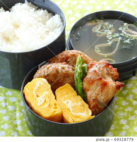 あたたかいとろろこんぶの汁物が付いた手作り弁当