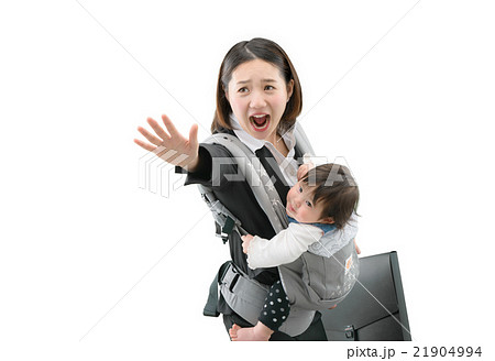 赤ちゃんを抱いてマイホームから飛び出してきた、ビジネススーツのお母さん