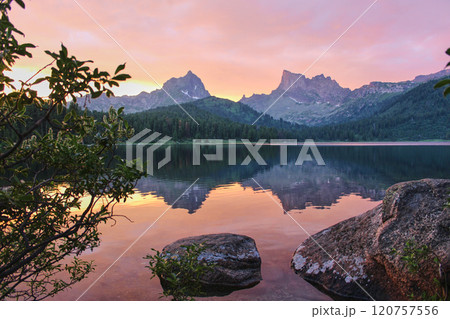Sunset on mountain lake. Siberian nature reserve. Quiet and calm evening