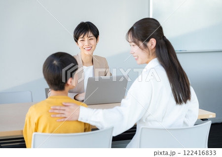 笑顔で三者面談を受ける親子と先生(中学生・高校生)