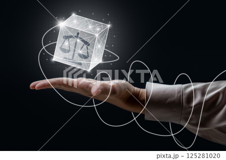 Businessperson showing a legal icon on the wireframe cube. Technology innovation on a virtual screen. Concept of law, justice, legal services, and business legislation