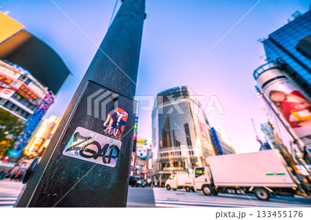 日本の東京都市景観剥がされたシール…早くも2枚目…。早朝の渋谷、幸福な時間…人影は少ない=8時11分