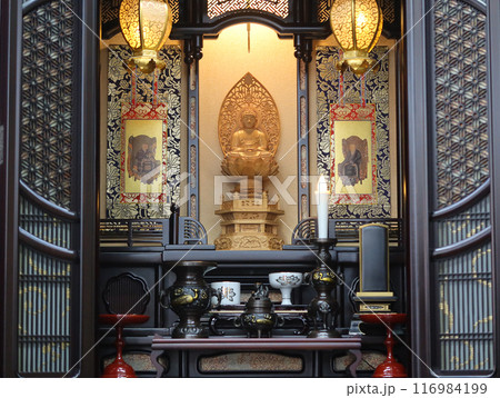 唐木仏壇に祀られた阿弥陀様と浄土真宗西本願寺用の仏具