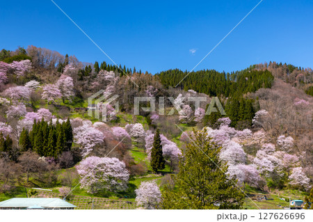 長野県上水内郡小川村高府 斜面一面にオオヤマザクラやエドヒガンなどが咲く二反田の桜