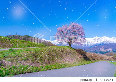【桜吹雪素材】野平地区の一本桜と冠雪した北アルプス【長野県】