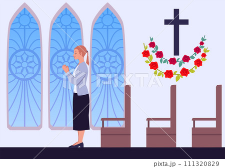 Christian church cartoon scene with a praying young woman vector illustration, religious person near cross in church