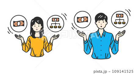 支払い方法の選択 - 一括払いと分割払いの天秤を表している人物イラスト