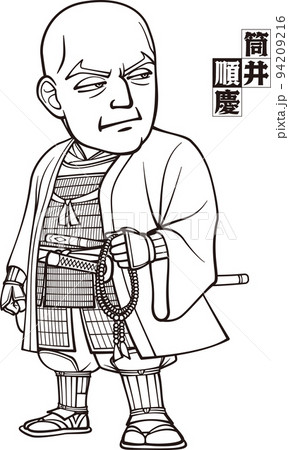 鎧をまとった筒井順慶の立ち姿【3頭身・白黒・ベクター】