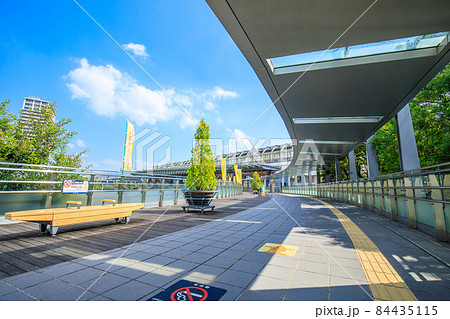 岐阜市 岐阜駅の駅舎とペデストリアンデッキと長良川鵜飼モチーフのベンチと植栽